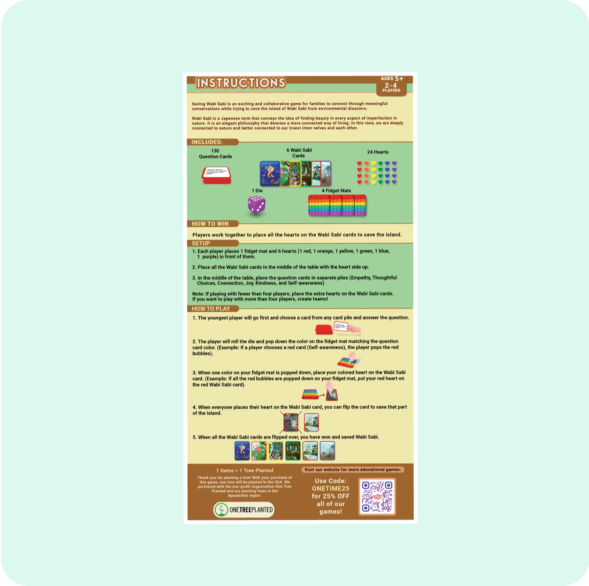 Yes, Saving Wabi Sabi is ideal for ages five and up, making it suitable for young children, teens, and adults. The questions and challenges are designed to be inclusive and adaptable, so players of all ages can engage meaningfully at their own level.